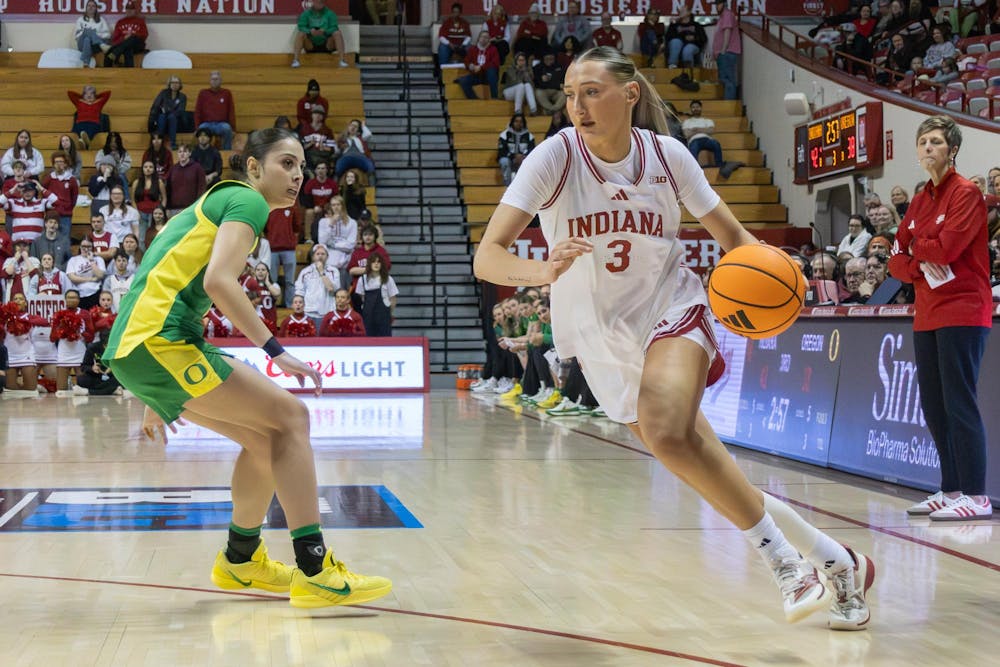 Freshman forward Maya Makalusky dribbles the ball in the game against Oregon on Feb. 22, 2026, at Simon Skjodt Assembly Hall in Bloomington. Makalusky had one assist in the game.