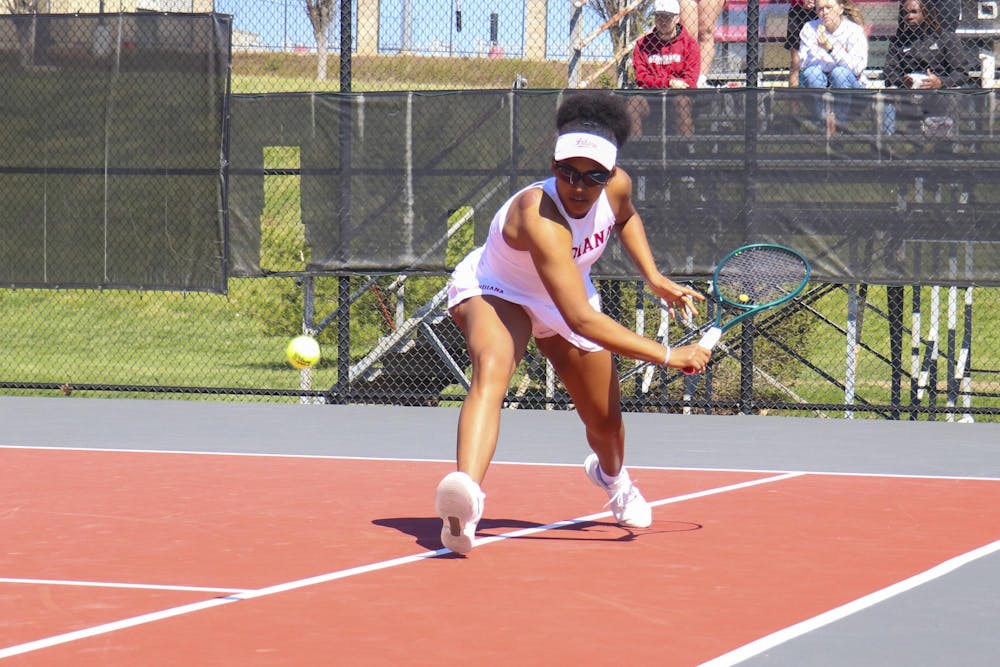 Freshman Hi'ilani Williams reaches down to hit the ball during the match against Nebraska on March 29, 2026, outside of the IU Tennis Center in Bloomington. Williams and freshman Alessandra Teodosescu lost their doubles match 6-4. Jimmy Rush