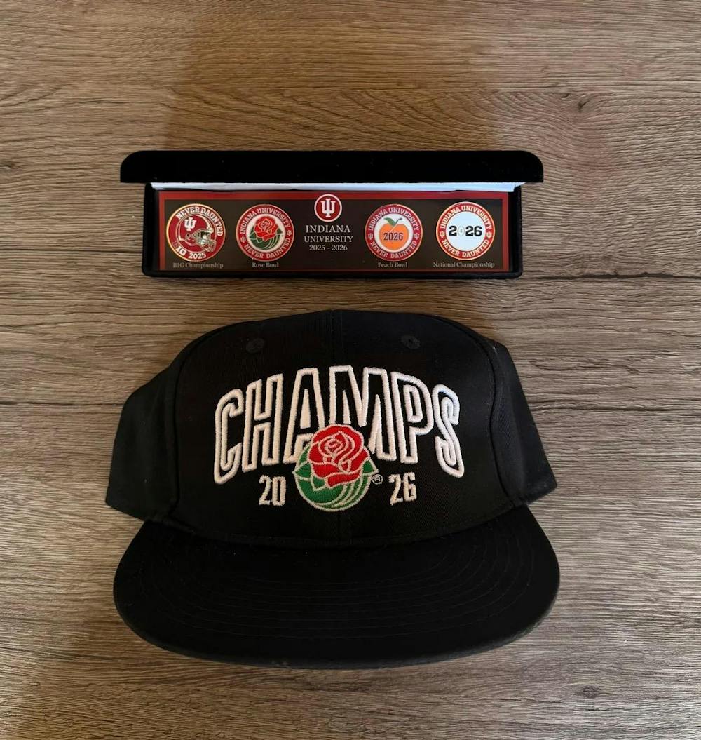 A Rose Bowl championship hat and a College Football Playoff commemorative pin set rest on a wooden surface Feb. 28, 2026. The items came from Indiana football offensive lineman Carter Smith and IU President Pamela Whitten's office.
