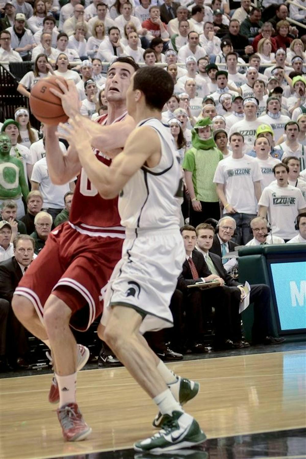 Junior forward Will Sheehey attempts to shoot a basket during IU's 72-68 win against Michigan State on Tuesday at Breslin Center.