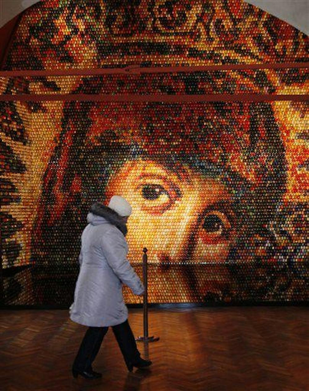 A women looks at the image of the Holy Mother, created from Easter eggs in the St. Sophia Cathedral in Kiev, Ukraine, Monday, Jan. 18, 2010. About 15 thousand eggs hand-painted in traditional Ukrainian style were used by Ukrainian artist Oksana Mas during creation of the composition.