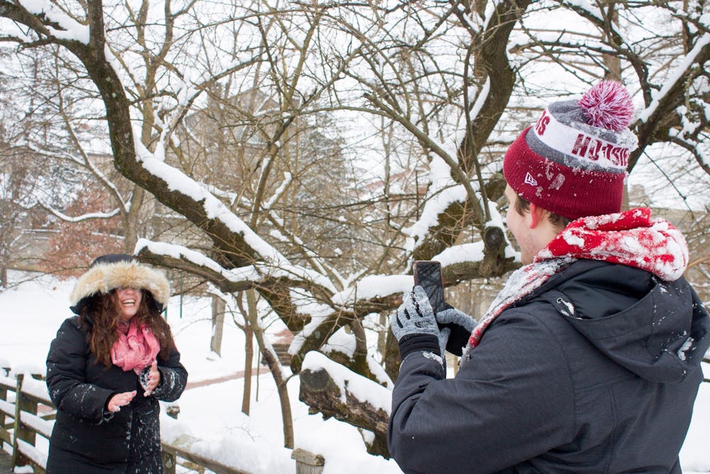 Junior Nathan Blair takes a photo of junior Alexis Kane on Tuesday near Dunn Meadow. Kane, who is from Dallas, Texas, went sledding for the first time Tuesday.