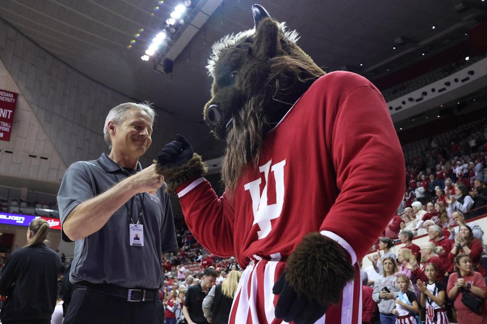 Indiana mascot Hoosier the Bison fist bumps a security guard during a women's basketball game against Butler on Nov. 19, 2025, inside Simon Skjodt Assembly Hall in Bloomington. Hoosier made his public debut at Indiana football's season opener against Old Dominion University on Aug. 30.