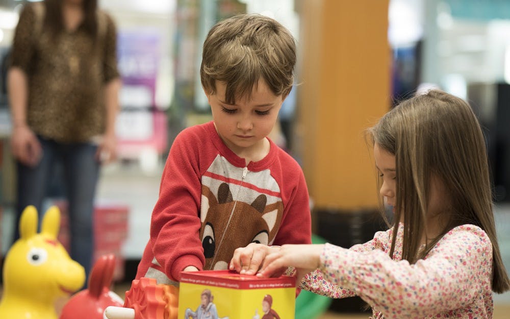 Makenna Warner and Quincey Reed play with the Curious George jack-in-the-box at the Toy Chest. The Toy Chest in the college mall held an event Friday night where kids could play with toys and meet Curious George. Rose Bythrow and Rose Bythrow and Rose Bythrow