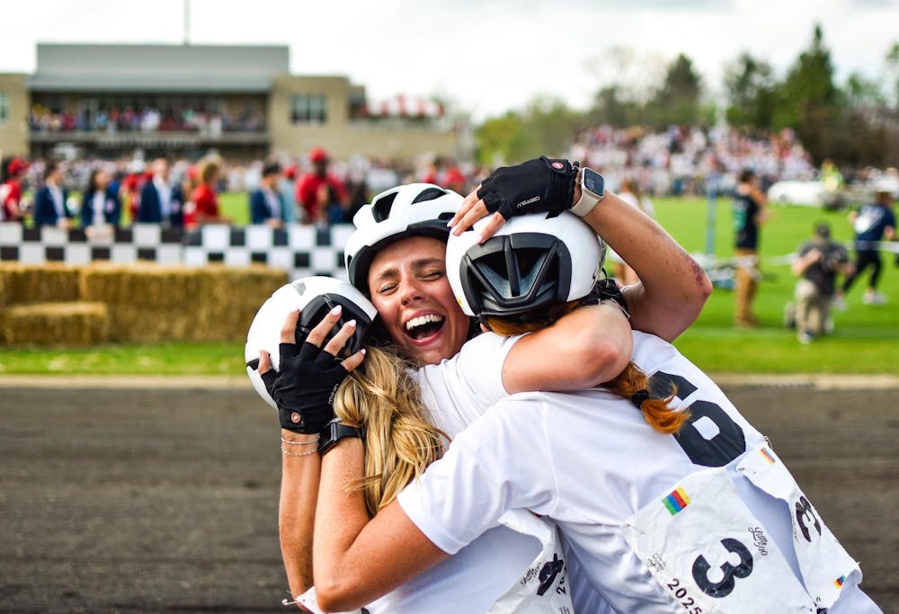 The Alpha Chi Omega racers hug after placing second in the women's Little 500 race on April 25, 2025, at Bill Armstrong Stadium in Bloomington. Alpha Chi Omega first raced in the Little 500 in 1993.