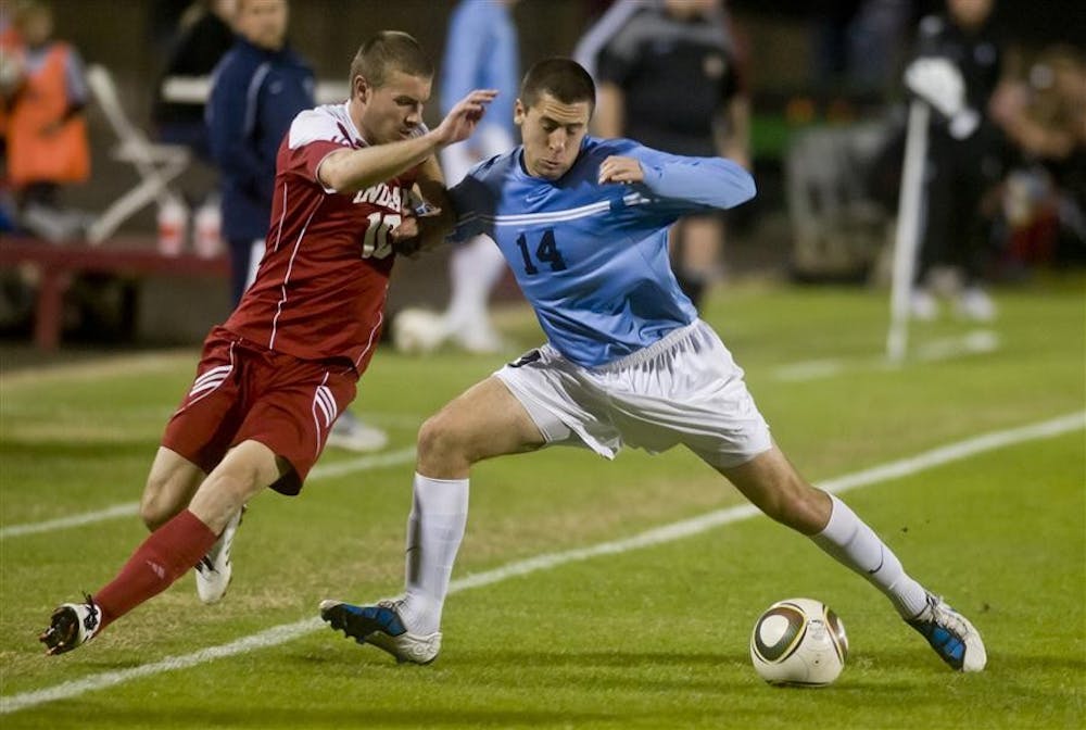 Senior midfielder Andy Adlard battles Butler's Jared Isenthal during IU's 4-1 loss to the Bulldogs on Wednesday at Bill Armstrong Stadium. Peter Stevenson
