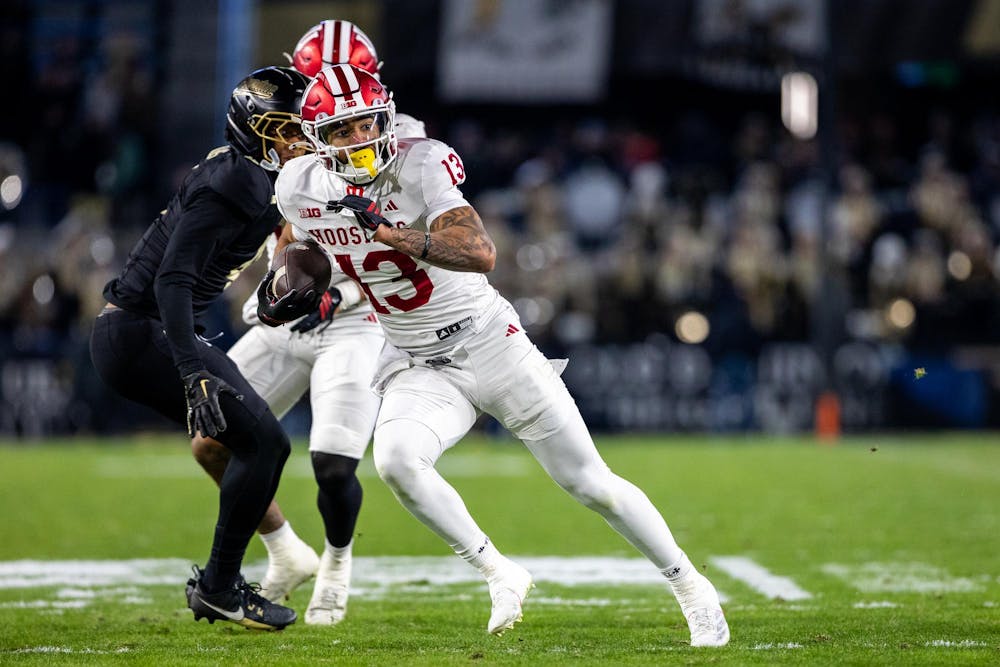 Senior wide receiver Elijah Sarratt sprints upfield after securing a catch as a Purdue defender closes in Nov. 28, 2025, at Ross–Ade Stadium in West Lafayette, Indiana. Sarratt scored one touchdown off of the play in the third quarter of the game.