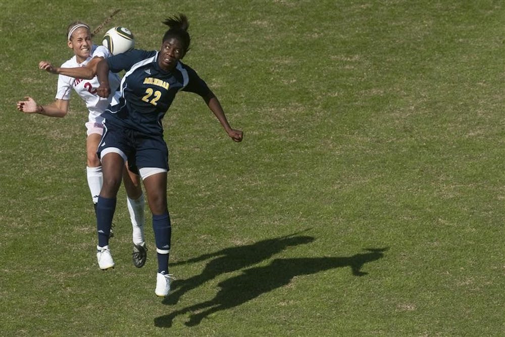 Junior defender Margot McAuley challenges Michigan's Nkem Ezurike during IU's 2-1 loss to the Wolverines on Sunday at Bill Armstrong Stadium.