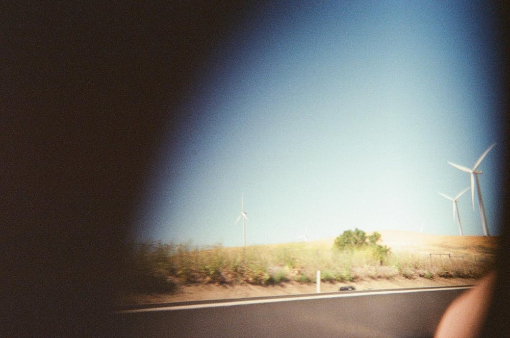 A partially black out image of wind turbines on the side of the road June 6, 2024, in the San Francisco Bay Area in California. Columnist Sophie Albert shot this photo with a Kodak Ultra F9 film camera. Sophie Albert