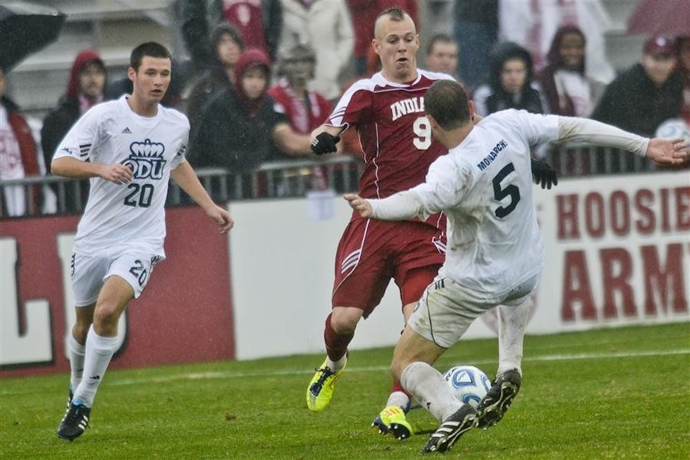 Senior midfielder Alec Purdie fights for the ball during the Hoosiers' 3-0 victory against Old Dominion during Indiana's first round of NCAA tournament Sunday at Jerry Yeagley Field.