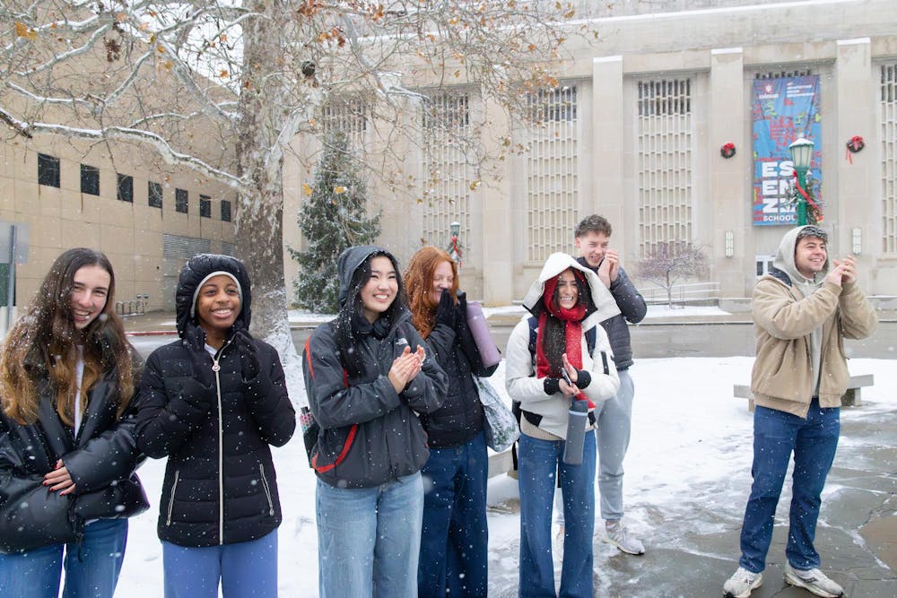 Attendees cheer for Max Augustini at the Fernando Mendoza Lookalike Contest on Dec. 13, 2025, at Showalter Fountain in Bloomington. The winner of the contest was decided by the amount of applause from attendees.