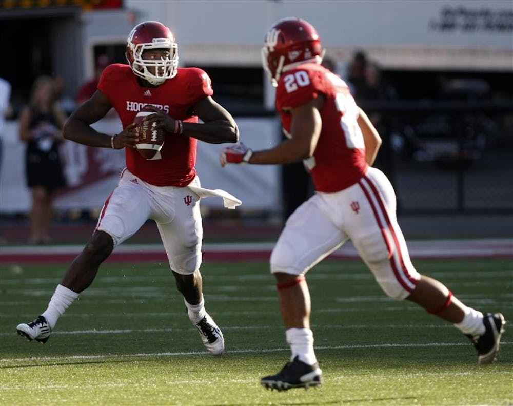 Sophomore quarterback Edward Wright-Baker looks for a receiver upfield Saturday at Memorial Stadium. Mark Felix