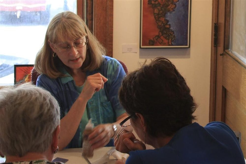 Susan Treehawks chats with attendees of the mosaic art demonstration led by Treehawks and her business partner and fellow mosaic artist Connie Simmonds on Tuesday at the Venue Fine Arts and Gifts. The women have a studio in Nashville, IN where they sell their mosaic art and furniture as well as teach classes.