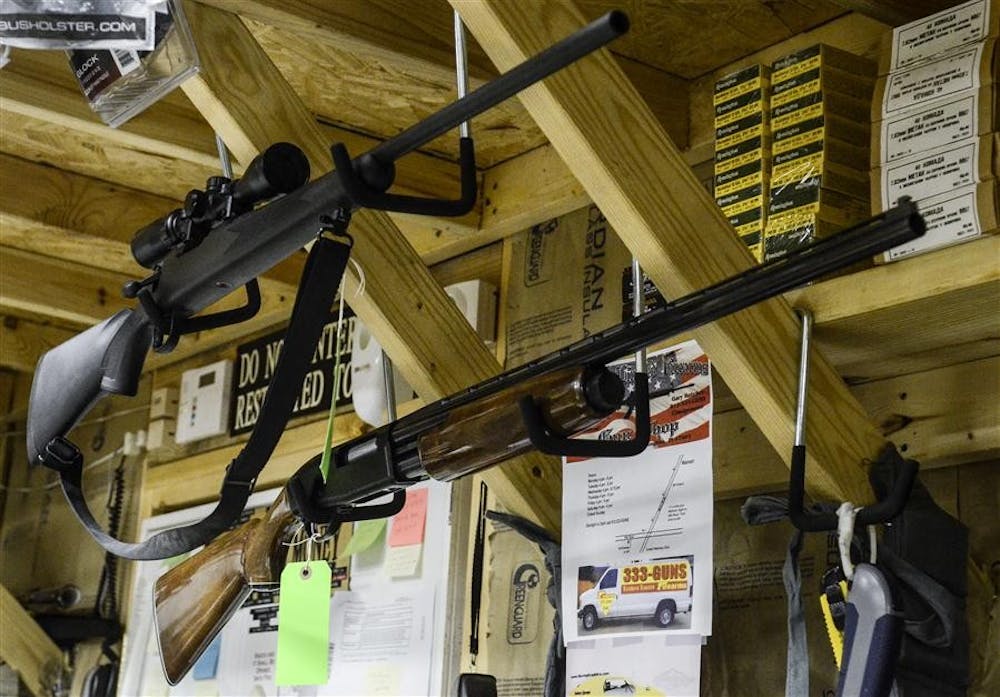 Guns for sale hang off a shelf on Thursday in Leathers Limited Firearms.