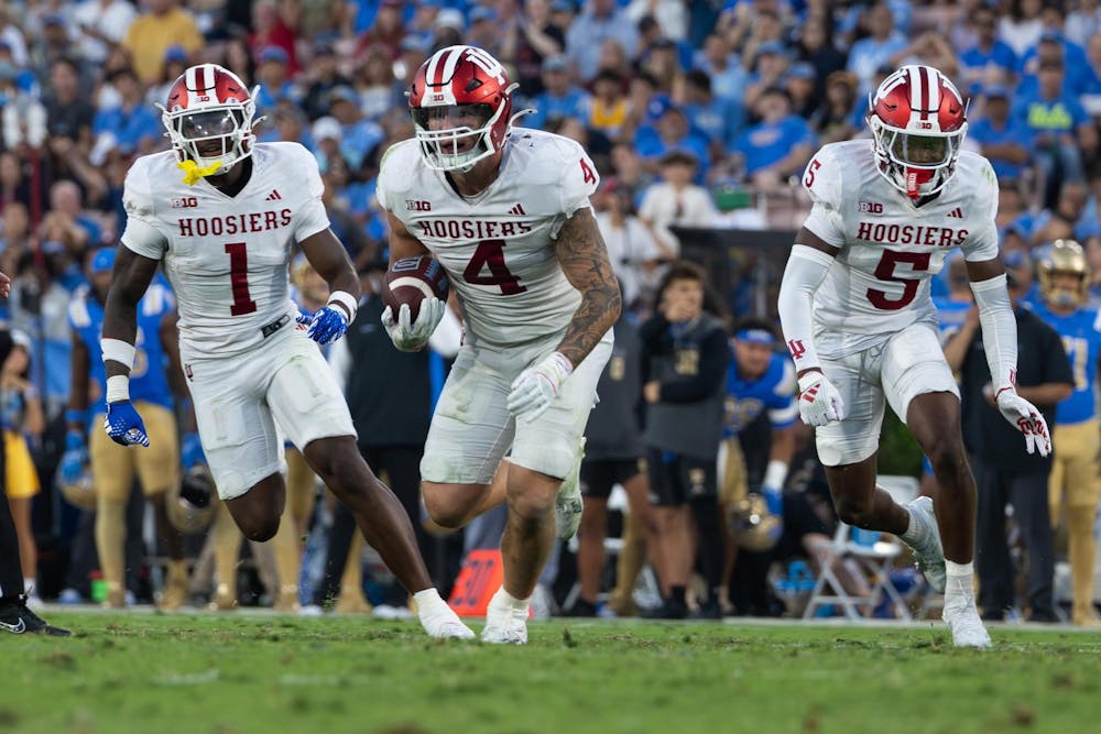 Senior defensive back Shawn Asbury II (left), junior linebacker Aiden Fisher (middle) and sophomore cornerback D'Angelo Ponds (right) run down the field during a game against UCLA on Sept. 14, 2024, at the Rose Bowl Stadium in Pasadena, California. Fisher made 118 tackles across his first season at Indiana in 2024.