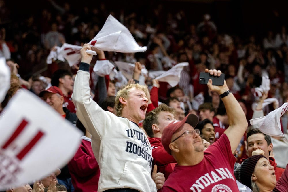 Roman Kopel waves his flag with the rest of the crowd Jan. 19, 2026, in Simon Skjodt Assembly Hall in Bloomington. Kopel celebrated during the first quarter of the Hoosiers' national championship game against University of Miami.