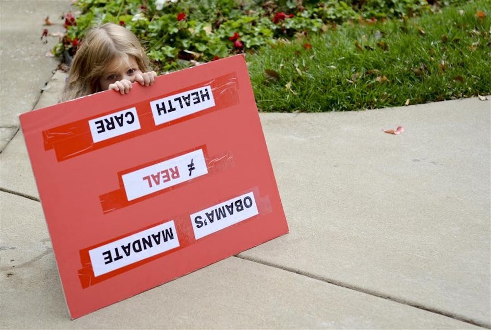 Chloe Bailey of Bloomington sits on the sidewalk in front of the Monroe County Courthouse holding a sign protesting President Barack Obama's health care iniatives on Saturday at the Stand Up For Religious Freedom Rally. There were rallies all over the country at noon Saturday.