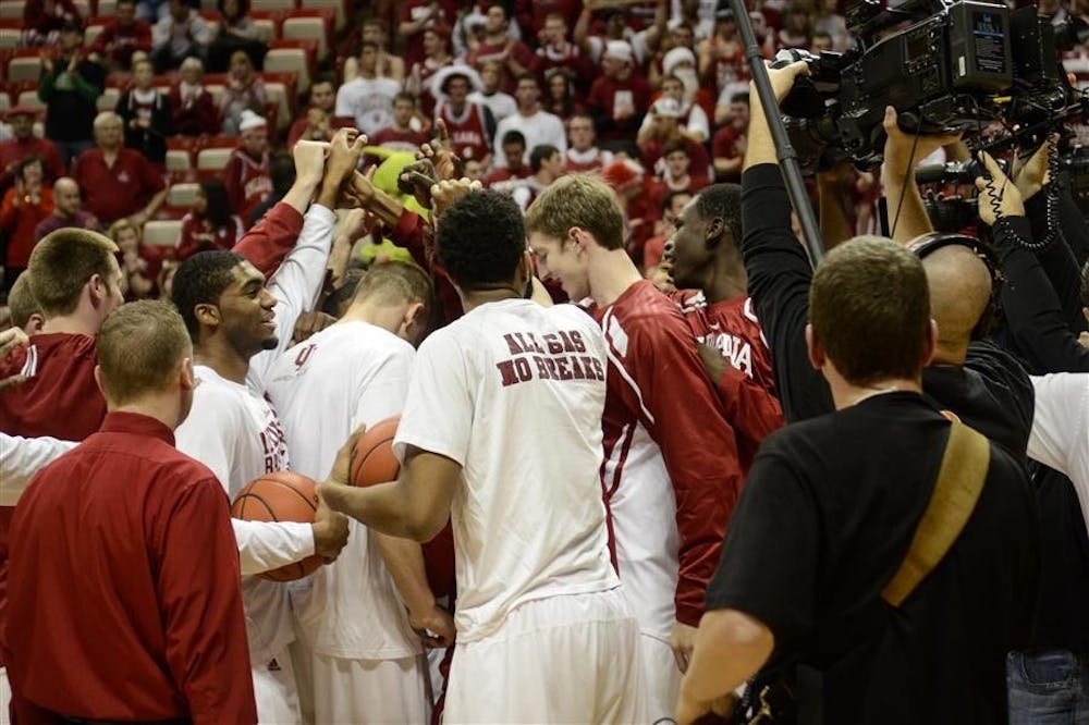 The IU men's basketball team huddles together after warming up for the game against Michigan on Saturday at Assembly Hall. The Hoosiers won 81-73. Steph Langan