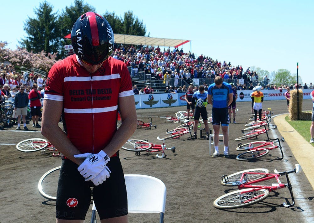 Luke Momper, rider of Delta Tau Delta, bow his head while Lauren Robel, IU Bloomington provost and executive vice president, gives an opening speech in remembrance of Hannah Wilson, IU student who was found dead on Friday.