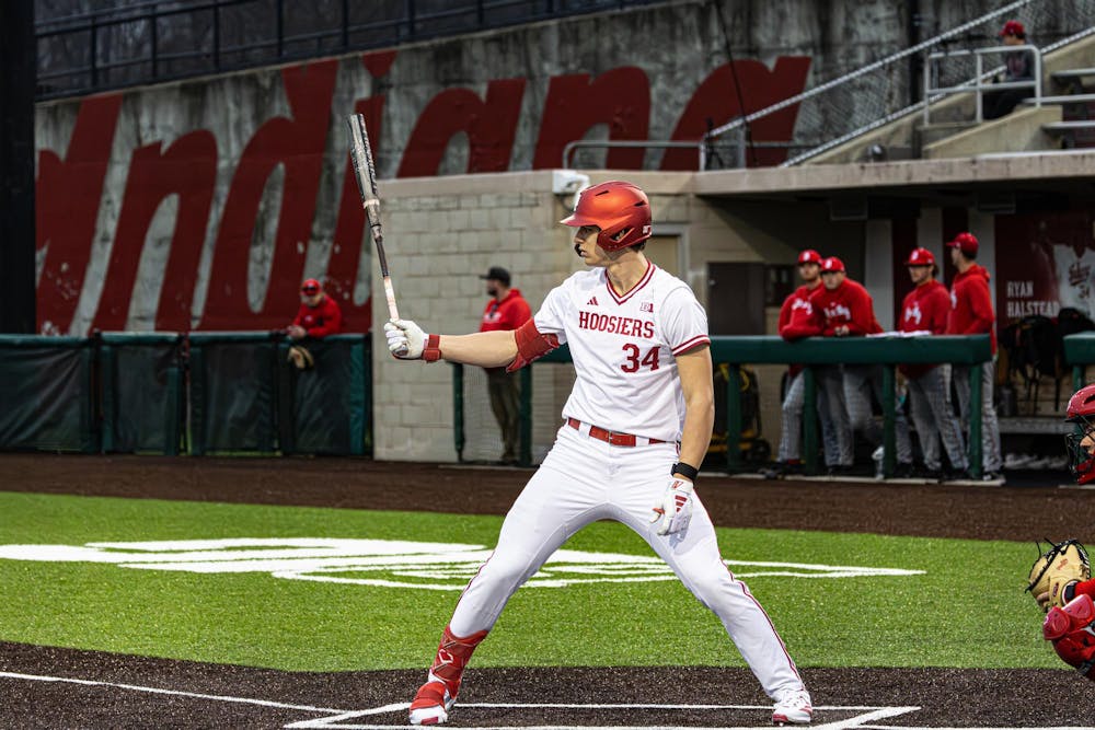 Sophomore infielder Jake Hanley prepares to bat during the game against Bradley University on Feb. 17, 2026, at Bart Kaufman Field in Bloomington. Hanley hit a home run in the game. Sophia Kaplan