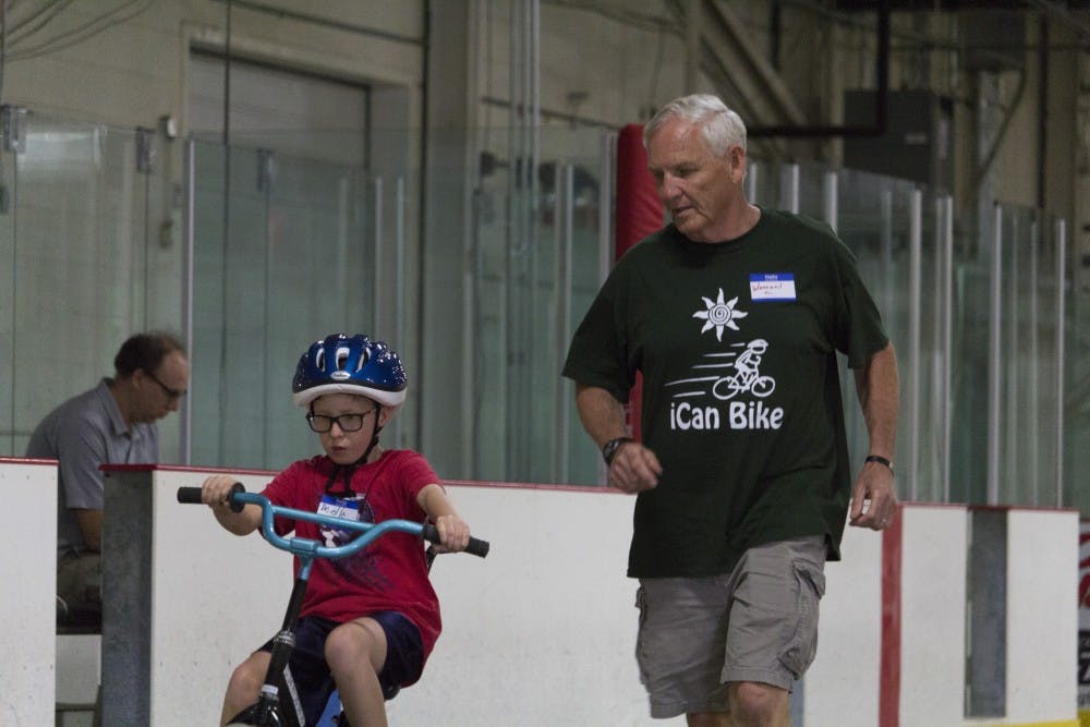 Volunteer Warren Smith (right) runs alongside his rider during the iCan Bike Camp on Thursday, May 17, in Frank Southern Ice Arena. Matt Begala