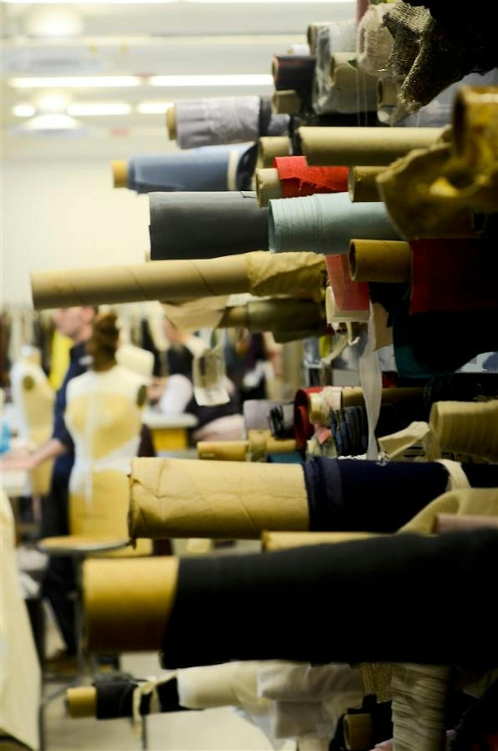 Rolls of fabric sit upon a shelf Friday in the costume studio of the Ruth N. Halls Theatre. Multiple theater students aided in making costumes in preparation for the performance of "Hair."