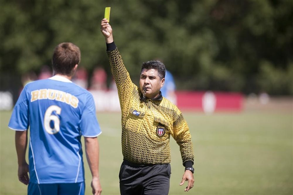 UCLA defender and former Hoosier Matt Wiet is shown a yellow card during IU's 5-1 victory against the Bruins Sunday at Bill Armstrong Stadium.