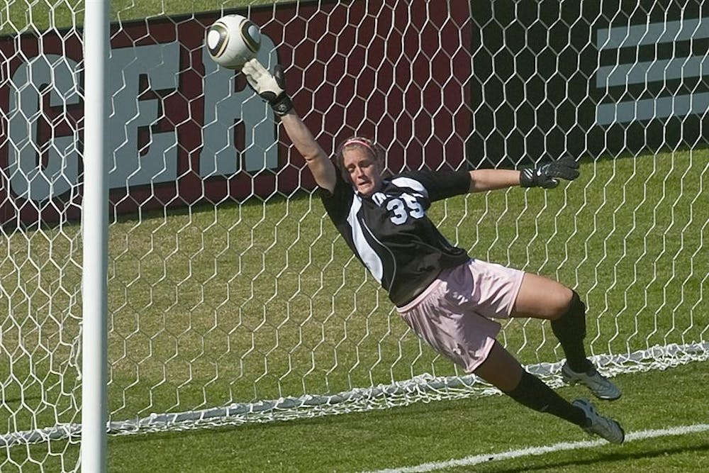 Freshman goalkeeper Shannon Flower attempts a save during IU's loss to Michigan on Sunday at Bill Armstrong Stadium. The ball ended up going wide and missing the net. Peter Stevenson