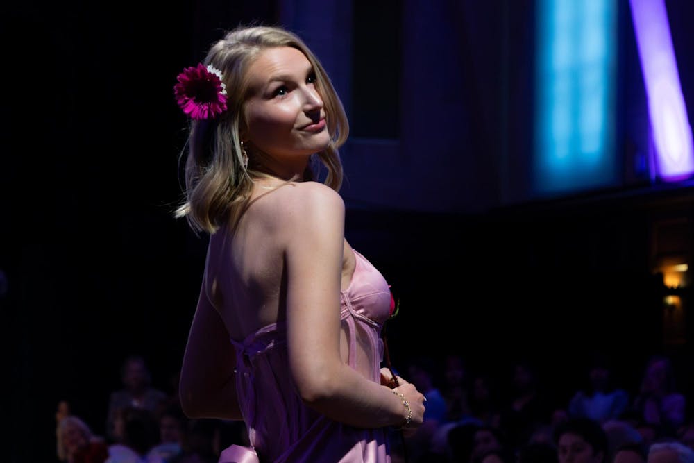 A model looks up and smiles during the IU Fashion Design B.A. Fashion Show on April 9, 2026, in Alumni Hall at the Indiana Memorial Union in Bloomington. She showcased a piece from the collection “Como la Flor” by Jocelyn Flores. Manasvi Doshi