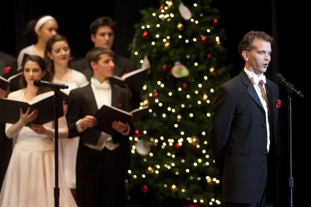 Singing Hoosiers Assistant Director Chris Ludwa speaks between songs at Chimes of Christmas on Wednesday at the IU Auditorium. Peter Stevenson