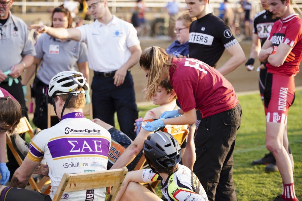 Participants gather as emergency medical technicians assist the wounded after a pile-up crash occurred during a practice session for Little 500 on April 12 at Bill Armstrong Stadium. Andrew Williams