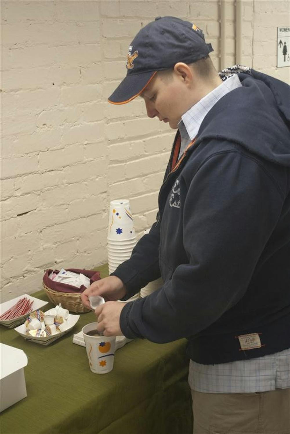 Continuing Studies student Cory Faust pours himself a cup of coffee at the Adult Student Appreciation Coffee Hour on Wednesday in Maxwell Hall. Faust is a religious studies major who is in his second year at IU after returning from active duty in Afghanistan. The coffee hour was hosted by the general studies program and the Adult Student Resource Center, which are both programs that cater to non-traditional students.