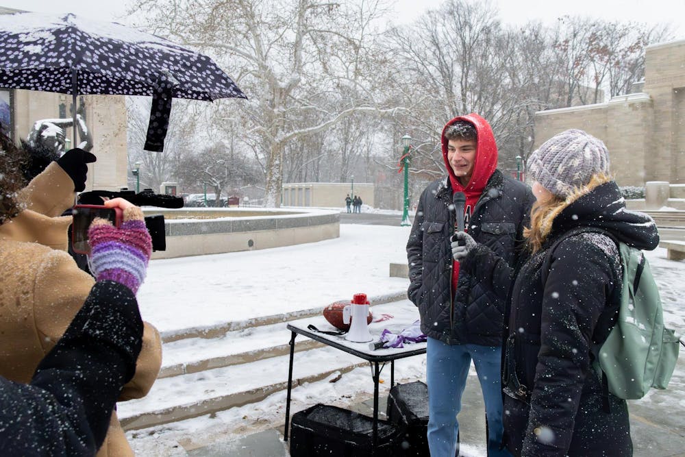 IU senior Max Augustini participates in a post-contest interview after the Fernando Mendoza Lookalike Contest on Dec. 13, 2025, at Showalter Fountain in Bloomington. After Augustini won the contest he had his photo taken and was interviewed.