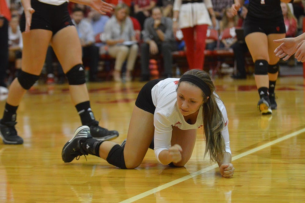 Senior defensive specialist Kyndall Merritt pounds her fist on the floor after missing a ball during the match against Purdue Wednesday evening at University Gym. The Hoosier lost to the Boilermakers 3 matches to 0. Rachel Meert and Rachel Meert