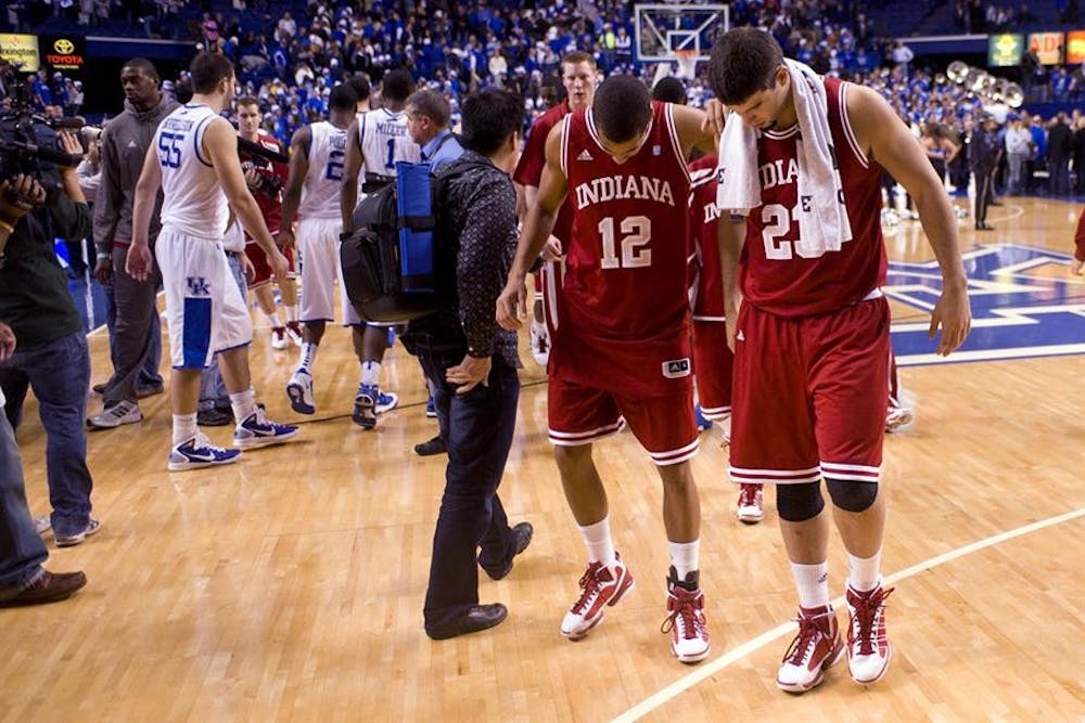 Junior guard Verdell Jones is helped off the court by sophomore forward Bobby Capobianco after IU's 81-62 loss to Kentucky on Dec. 11 at Rupp Arena in Lexington, Ky.