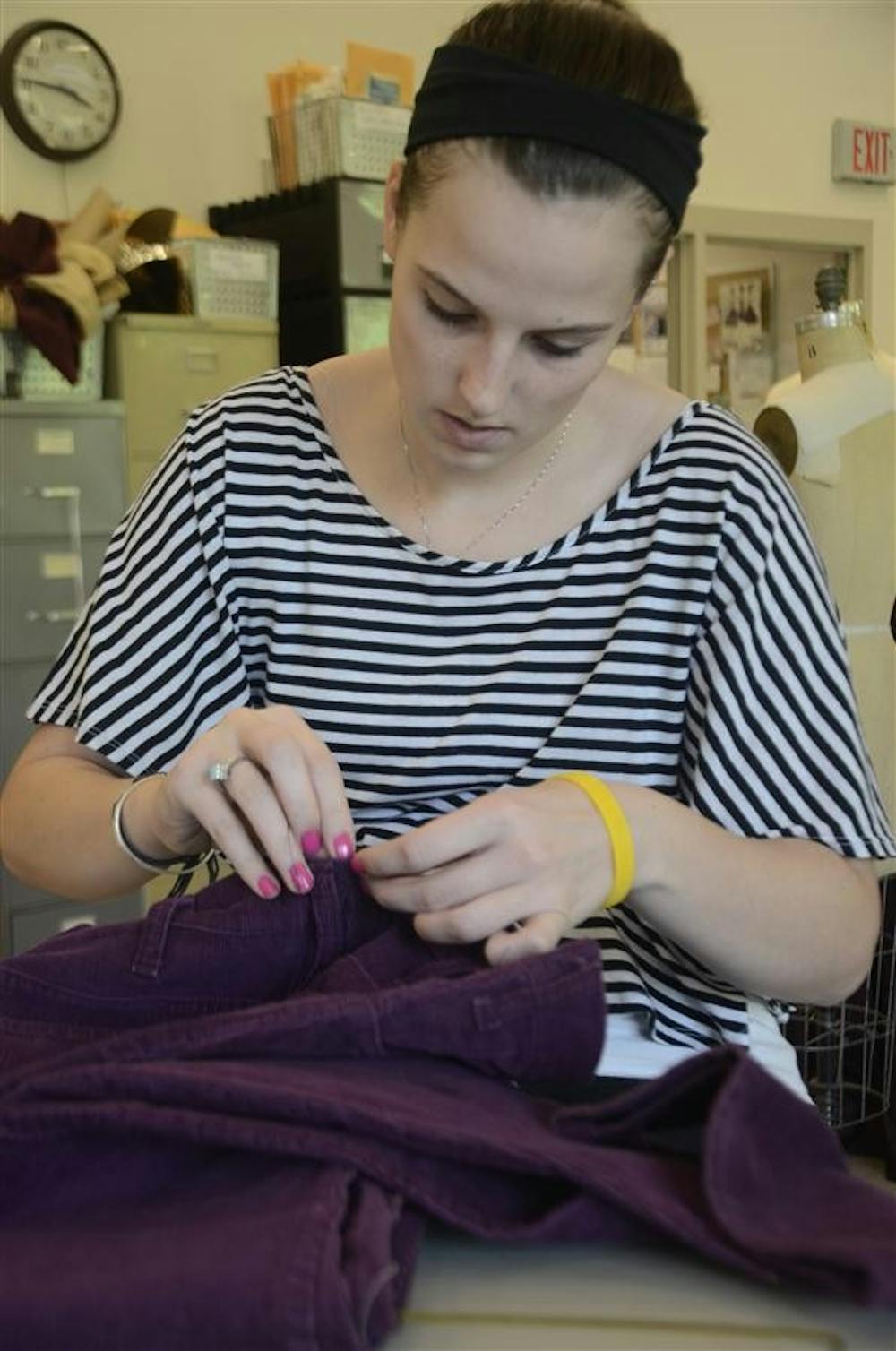 Sophomore Nicki Eberle stitches a label into a purple pair of pants Friday in the Ruth N. Halls Theater costume studio. Eberle is studying theater and helped out in the costume shop as part of a class. Steph Langan