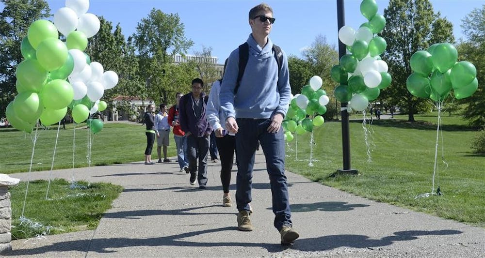 Balloons line the sidewalk as students walk through the arboretum on Wednesday. 1,100 balloons were placed in the arboretum by IUSA as a part of Culture of Care Week to represent the number of suicides that college students commit each year. The majority of the balloons were green in representation of mental health awareness.