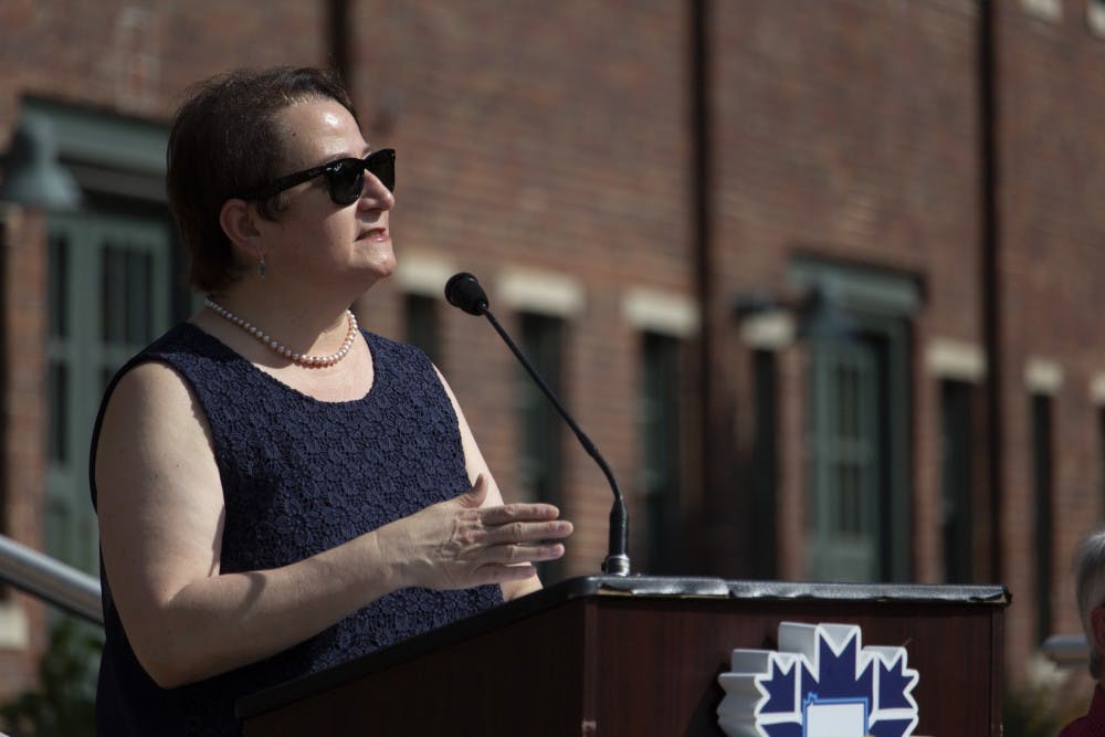 IU Provost Lauren Robel talks to the crowd during a press conference Wednesday, June 20, outside City Hall. The University partnered with the city of Bloomington to bring the Pace bike share service to residents, students and visitors.