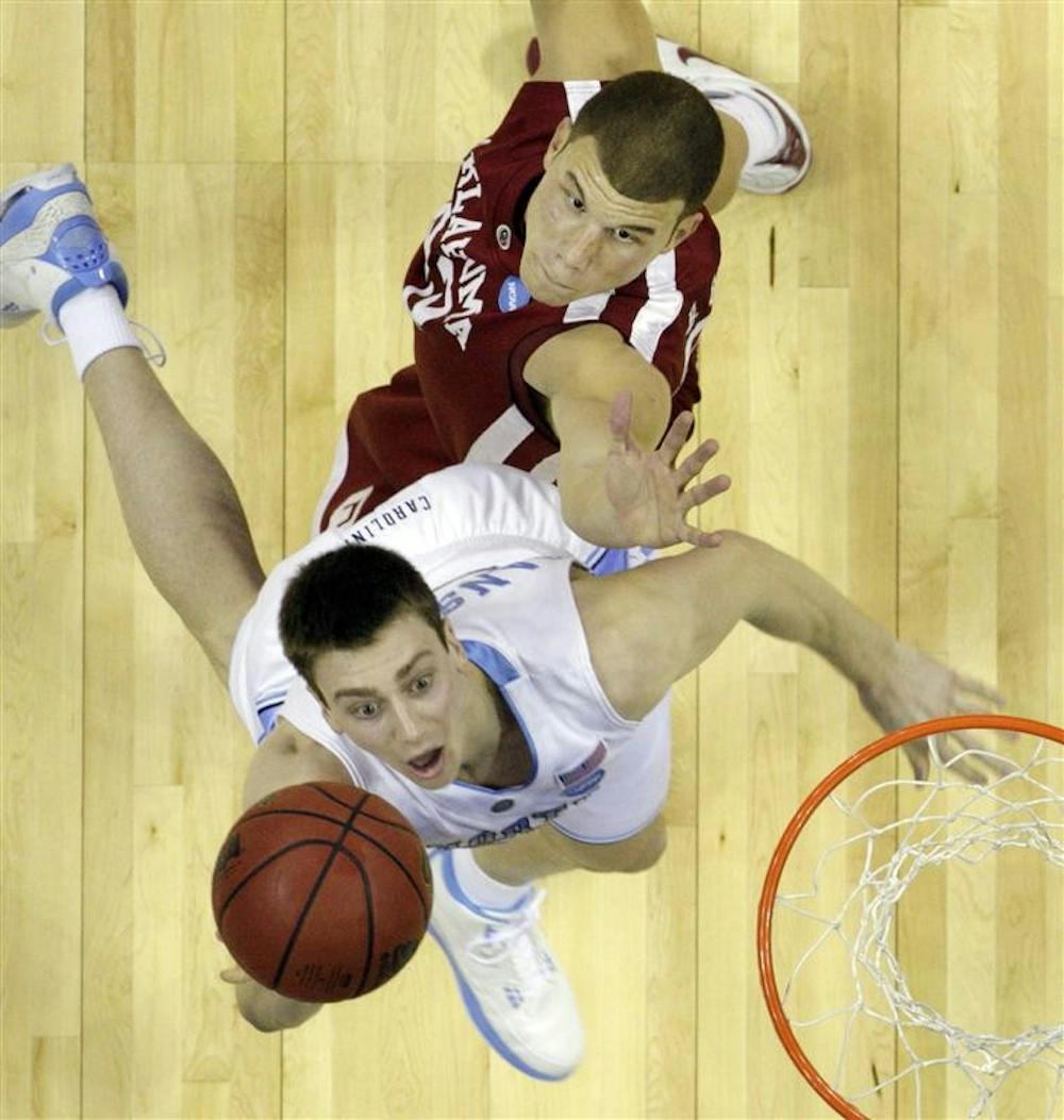 North Carolina forward Tyler Hansbrough, bottom, scores as Oklahoma forward Blake Griffin defends during the first half of the men's NCAA tournament South Regional championship college basketball game Sunday in Memphis, Tenn. North Carolina won 72-60.