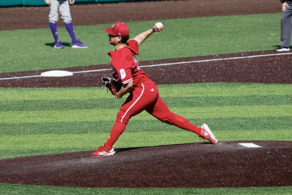 Graduate student right-handed pitcher Reagan Rivera delivers a pitch in a game against Washington on March 8, 2026, at Bart Kaufman Field in Bloomington. The Hoosiers lost the weekend series 2-1. Colin Slomka