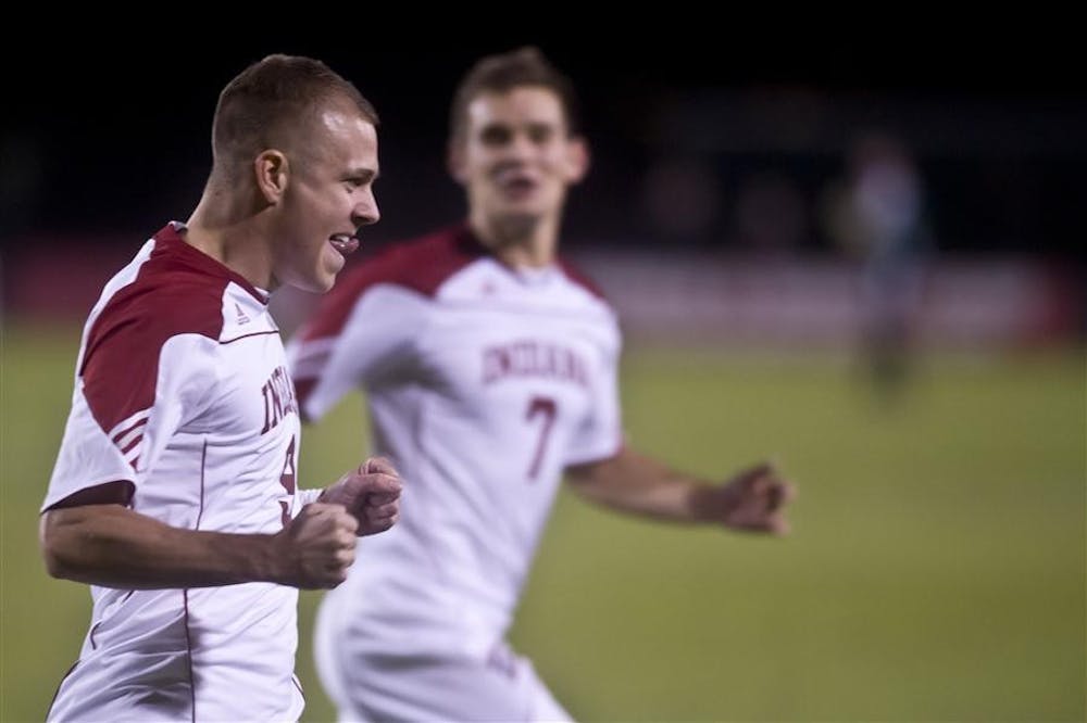 Junior forward Alec Purdie celebrates after scoring IU's first goal in a 2-1 win against Michigan on Saturday at Bill Armstrong Stadium. Peter Stevenson