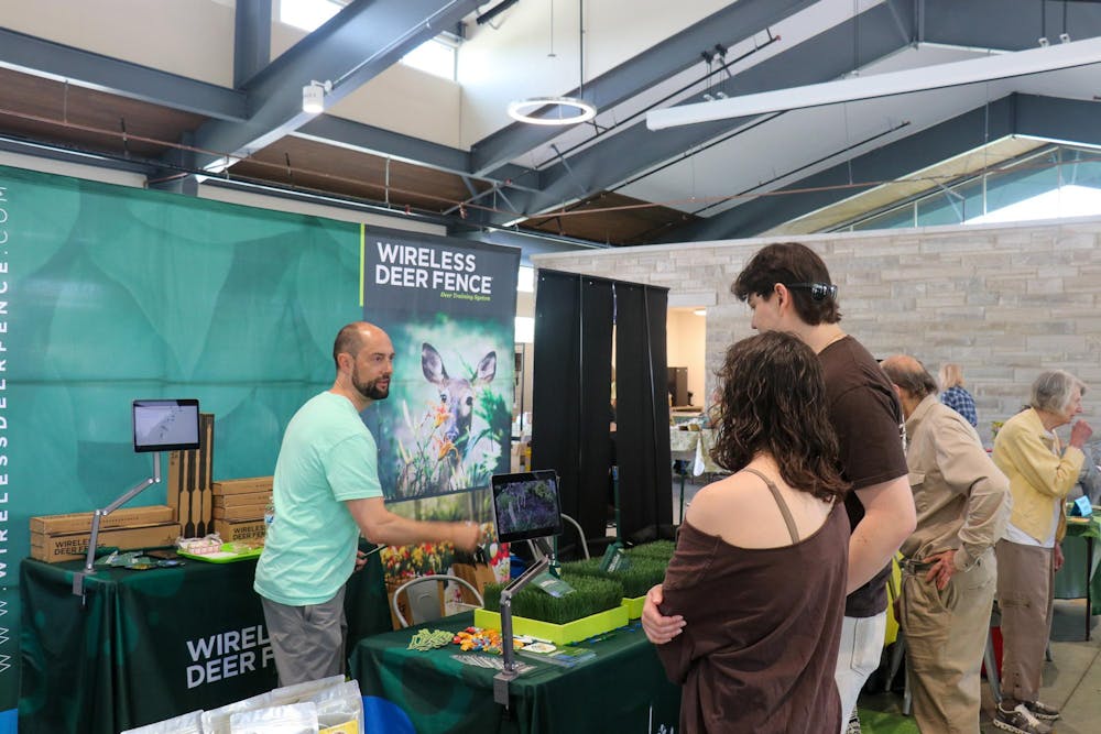An employee of Wireless Deer Fence shows a product to Monroe County Master Gardeners Association Garden Fair attendees April 11, 2026, at Switchyard Park in Bloomington. The product was a patented deer control method for preventing deer damage and keeping deer out of yards and gardens.
