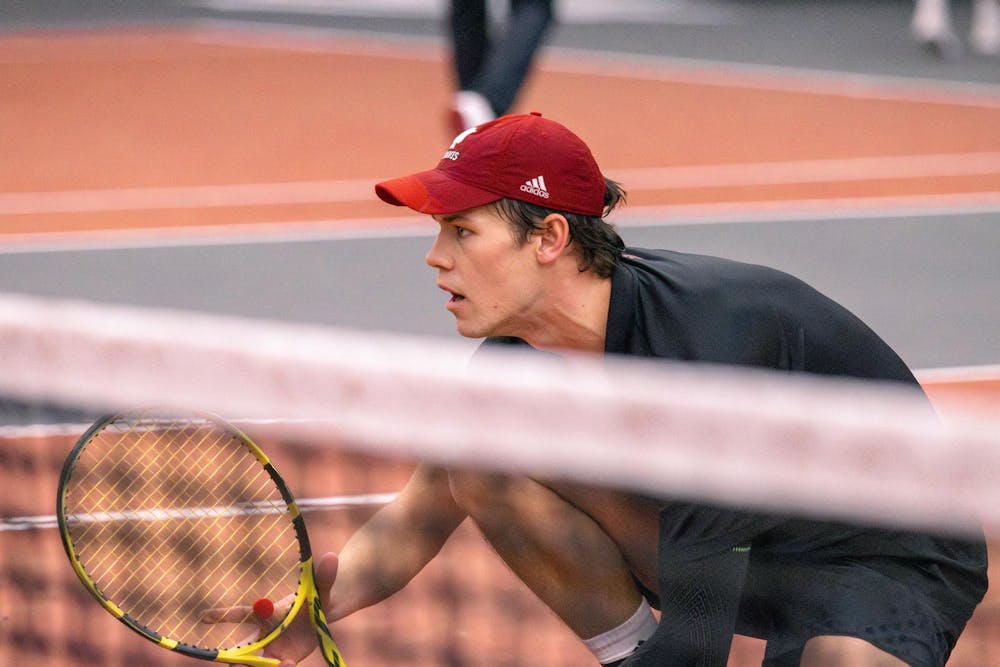 Graduate student Michael Andre crouches near the net as his partner sophomore Matteo Antonescu serves the ball during a match against Middle Tennessee State University on Feb. 1, 2026, in the IU Tennis Center in Bloomington. The pair won their doubles match 6-3.