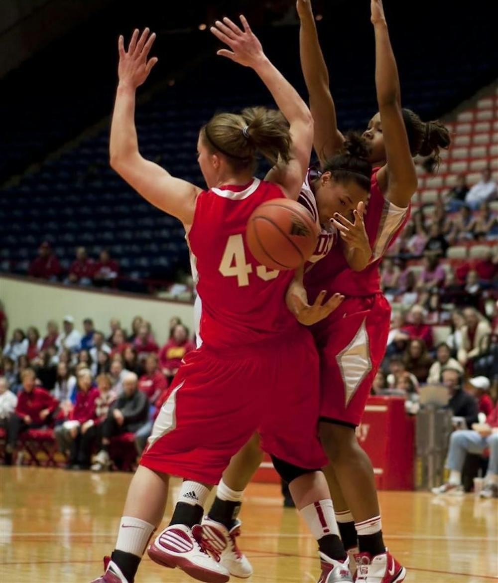 Junior guard Whitney Lindsay tries to dribble past two Ohio State defenders during IU's 67-62 win over the No. 4 Buckeyes Jan. 31 at Assembly Hall. Peter Stevenson