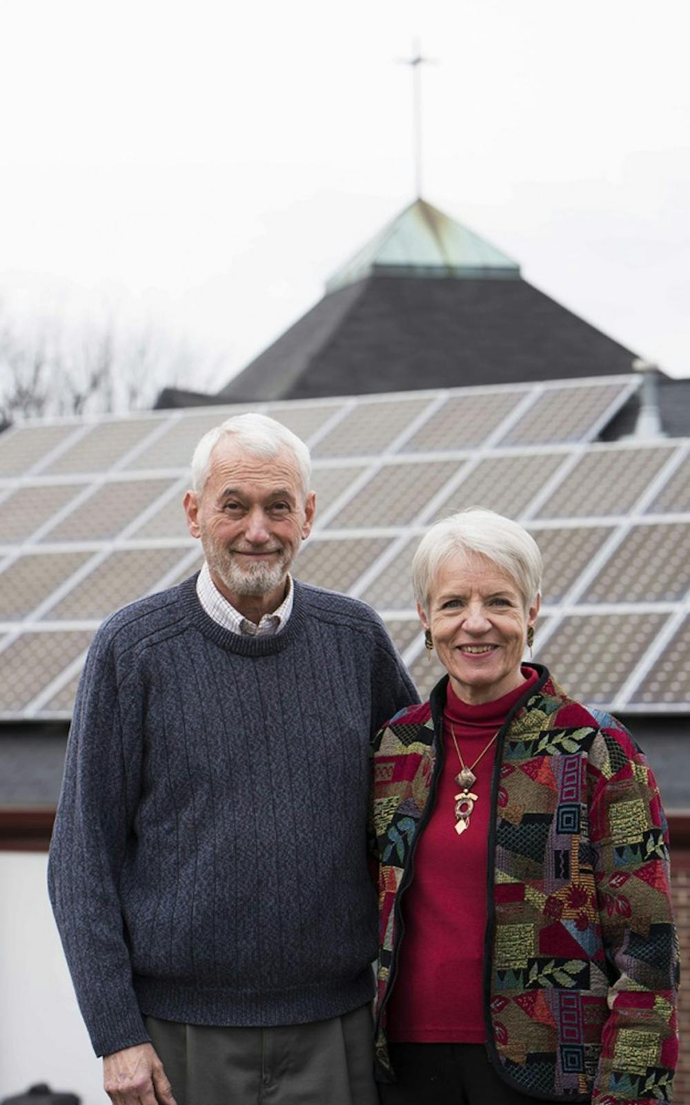 Darrel Boggess and his wife stand in front of St.Thomas Lutheran Church on East 3rd Street. The price of powering the church went from $5000 a month to $1000 after Darrel's initiative to add solar panels. Rose Bythrow and Rose Bythrow and Rose Bythrow