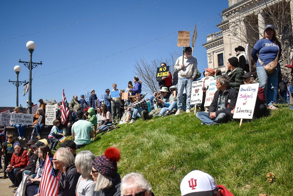 Demonstrators sit on the lawn surrounding the Monroe County Courthouse on March 28, 2026, for a “No Kings” protest in Bloomington. The protest lasted about two hours.