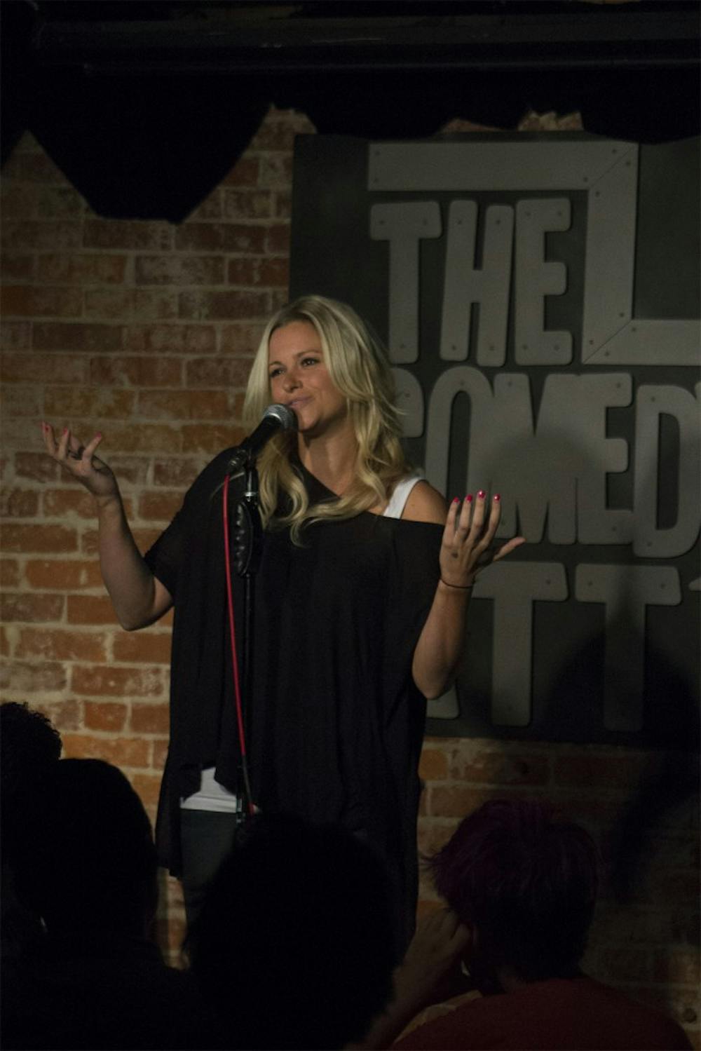Stephanie Lochbihler performs a stand-up comedy routine during the semifinals of the Bloomington Comedy Festival Wednesday evening at the Comedy Attic. Comedians Stephanie Lochbihler, Jordan Mather-Licht and David Britton will advance onto the final competition on Wednesday Aug. 26 at the Comedy Attic.