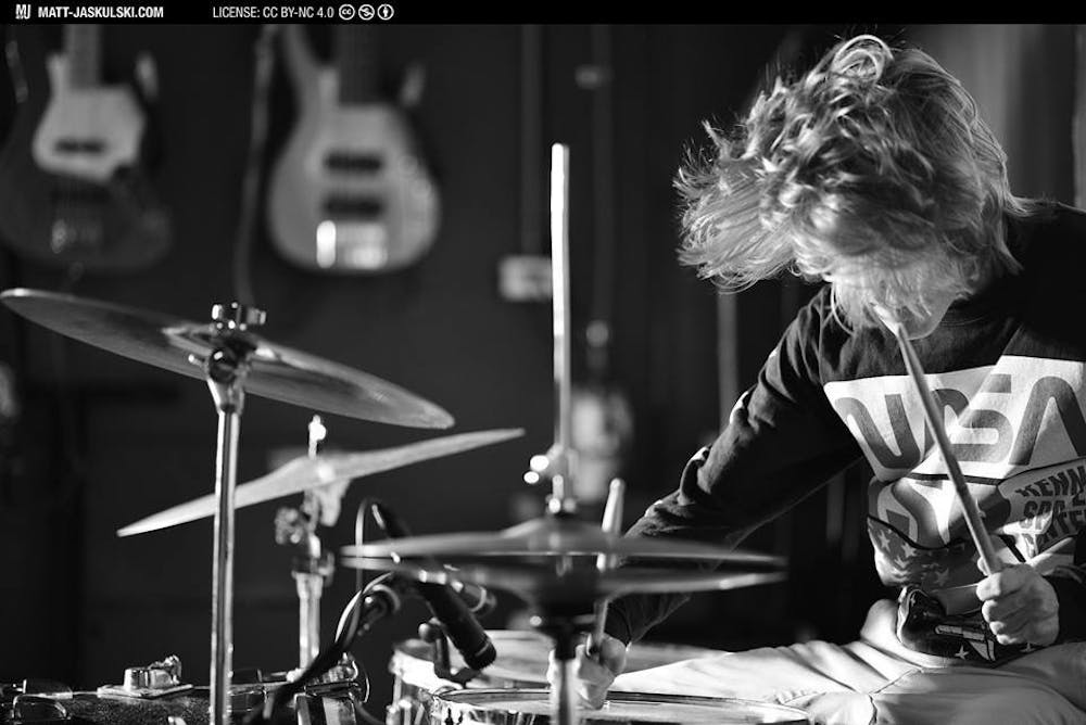 The Bloomington band Flower Mouth is composed of four members — Blake McKean, Gus Gonzalez, Chris Koj and Jonathan “JJ” Van Hecke. McKean is photographed on the drums during a concert.