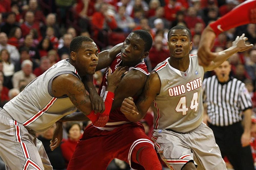 Sophomore guard Victor Oladipo (center) fights for a rebound with Ohio State's Deshaun Thomas (left) and William Buford (right) Sunday at Value City Arena. Mark Felix