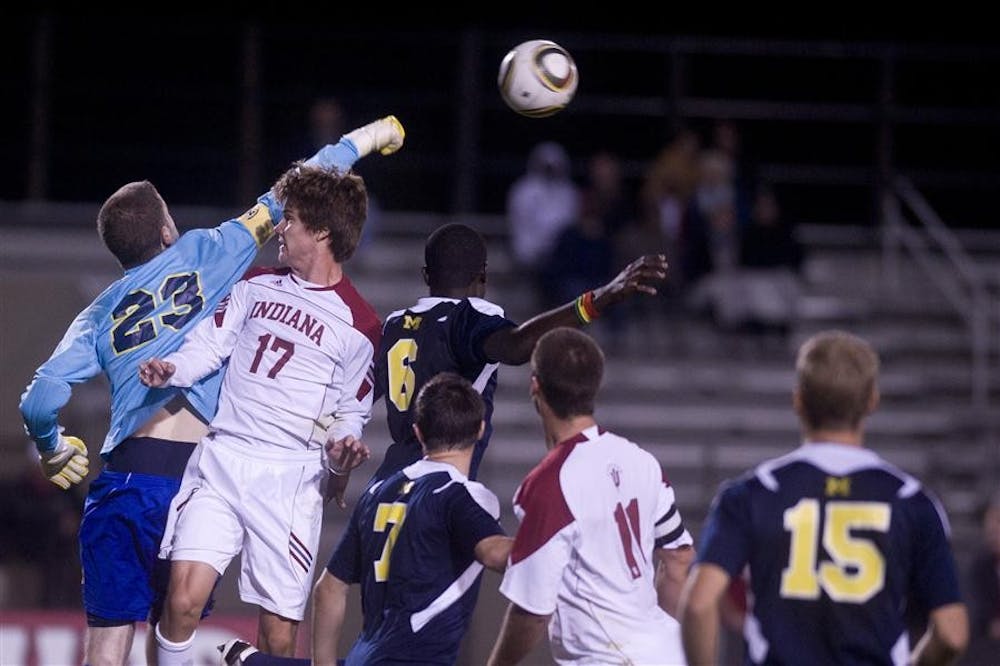 Michigan goalkeeper Chris Blais punches clear a cross as freshman forward Jacob Bushue challenges him during IU's 2-1 win against the Wolverines on Saturday at Bill Armstrong Stadium. Peter Stevenson